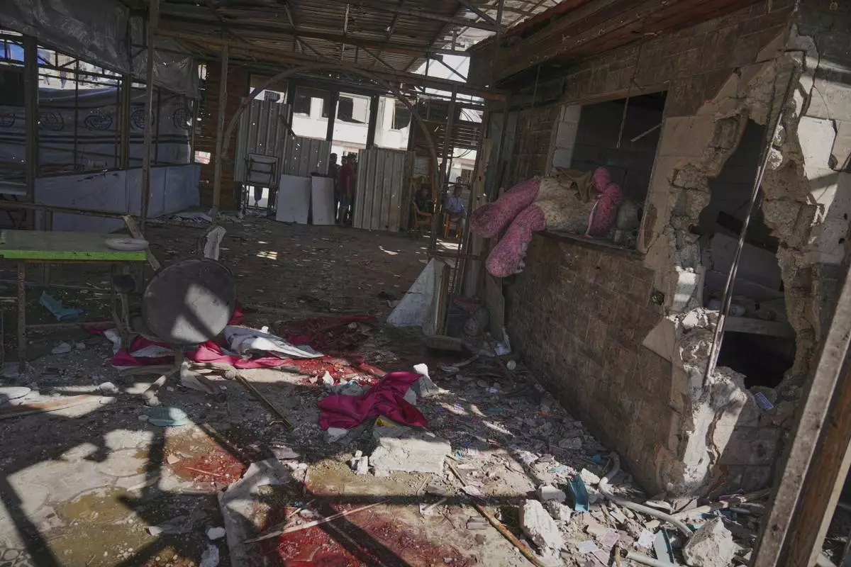 Blood, rubble, and what appears to be a giant stuffed doll lie scattered in a café after it was hit by an Israeli airstrike that killed more than 30 people near the port in Gaza City, Monday, June 30, 2025. (AP Photo/Jehad Alshrafi)