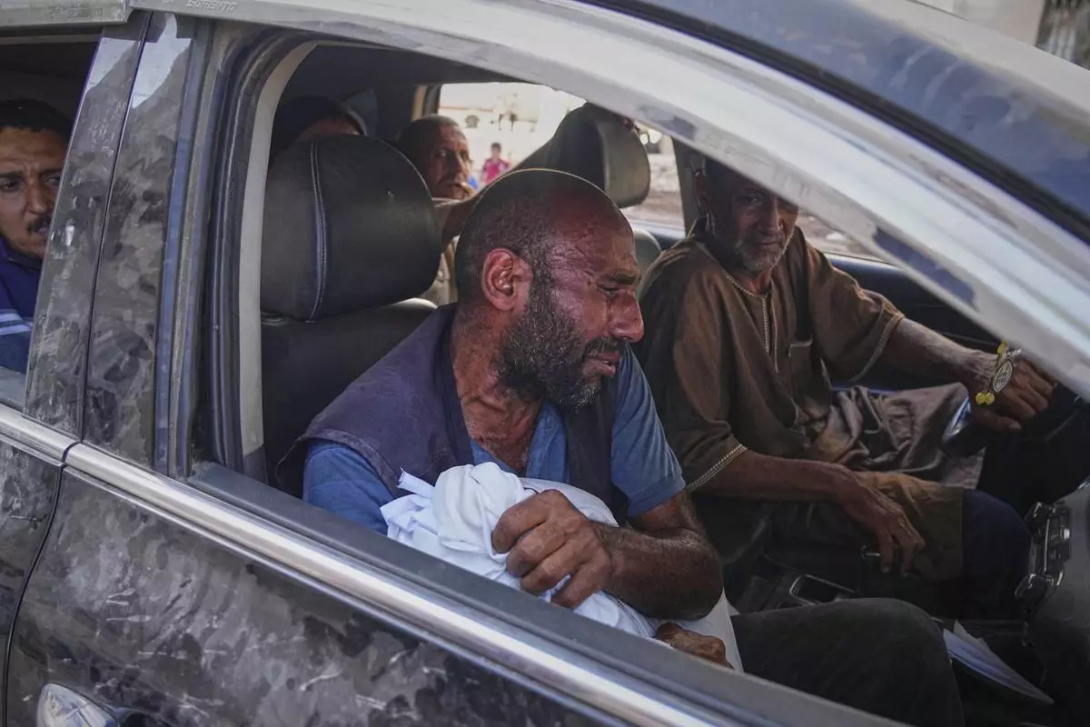 A man carries a child, who was killed in an Israeli strike, as he walks outside the Shifa Hospital, Gaza City, Monday, June 30, 2025. (AP Photo/Jehad Alshrafi)
