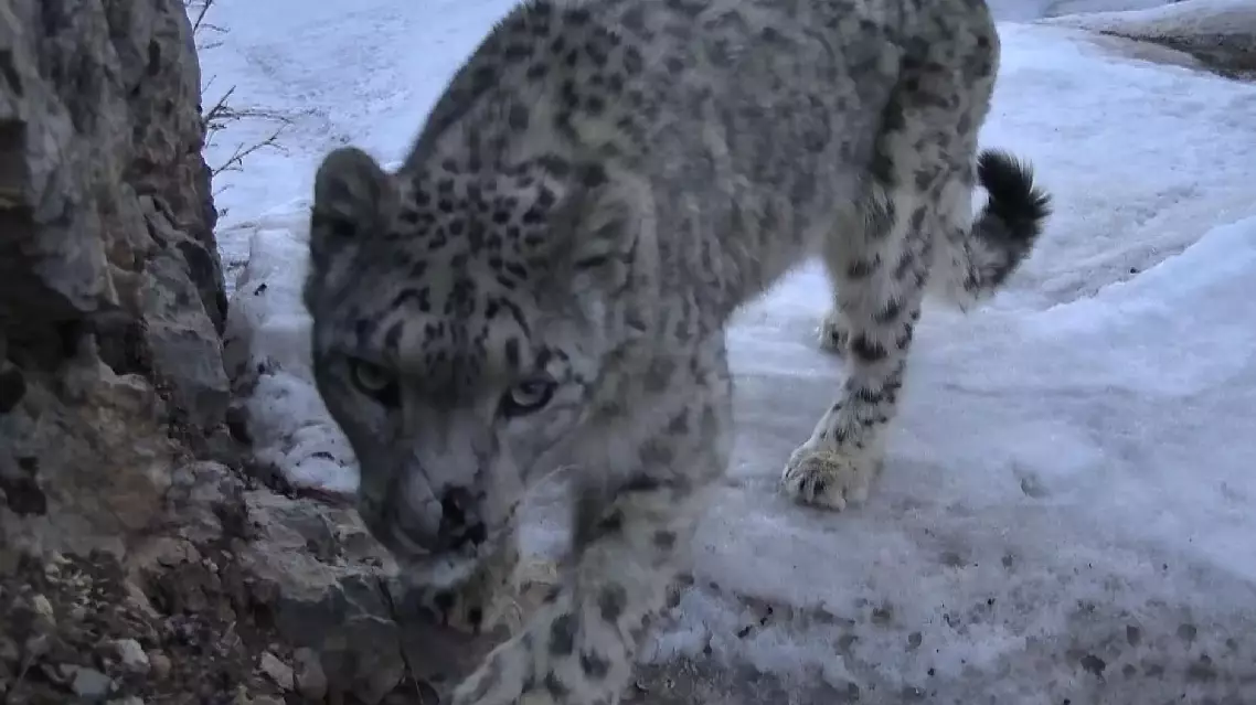 In the footage collected recently by the nature reserve staff, the two snow leopards are strolling leisurely through the snow in single file. The curious mother approached the camera lens, followed by her cub, estimated to be about one year old, who sniffed at the device.