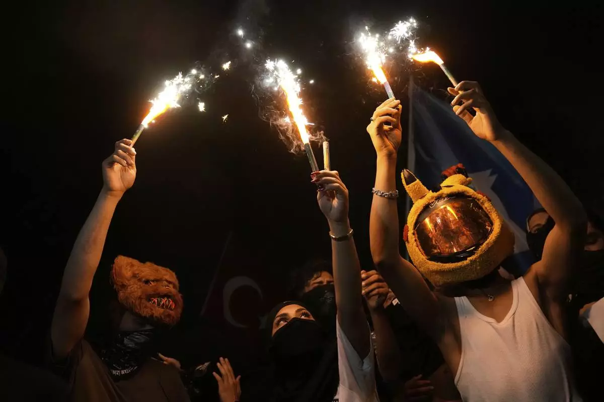 People light flares during a protest called by the main opposition Republican People's Party or (CHP), outside the City Hall in Istanbul, Turkey, Tuesday, July 1, 2025. (AP Photo/Khalil Hamra)