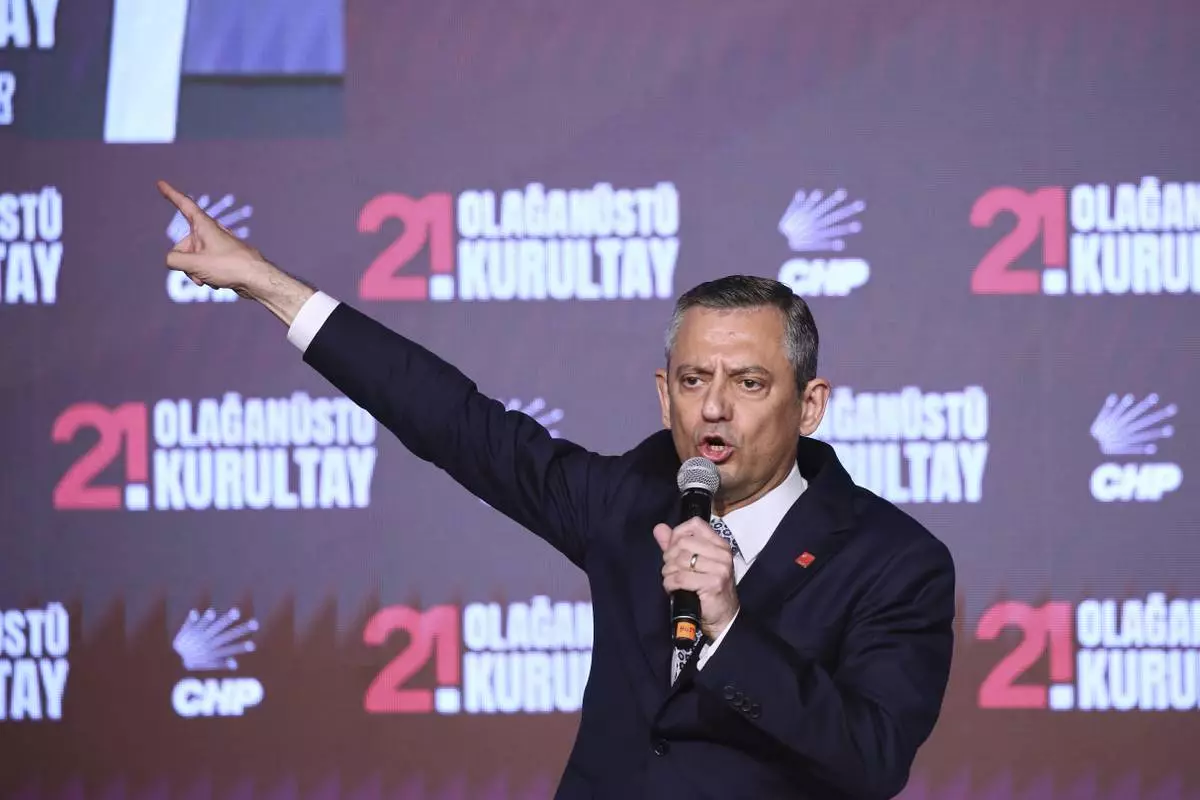 FILE - Republican People's Party or (CHP) leader Ozgur Ozel delivers a speech during a CHP convention, in Ankara, Sunday, April 6, 2025. (AP Photo/Ali Unal, File)
