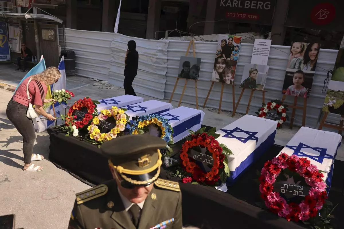 People attend a memorial service ceremony for five Ukrainian citizens who were killed in a Iranian missile strike as they stand next to a damaged residential building in Bat Yam, Israel, Monday, June 30, 2025. (AP Photo/Tomer Apelbaum)