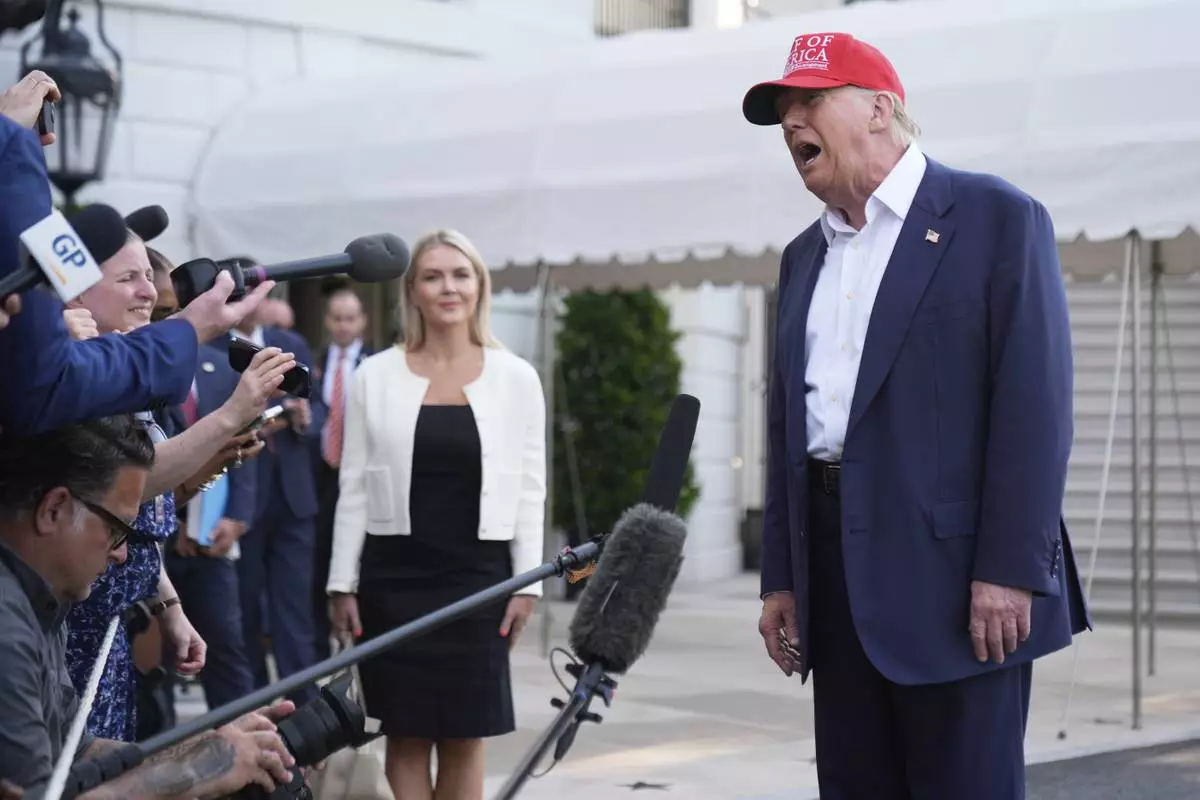 President Donald Trump speaks to the media before walking across the South Lawn of the White House to board Marine One en route to Joint Base Andrews, Md., and on to Florida, Tuesday, July 1, 2025, in Washington. (AP Photo/Mark Schiefelbein)
