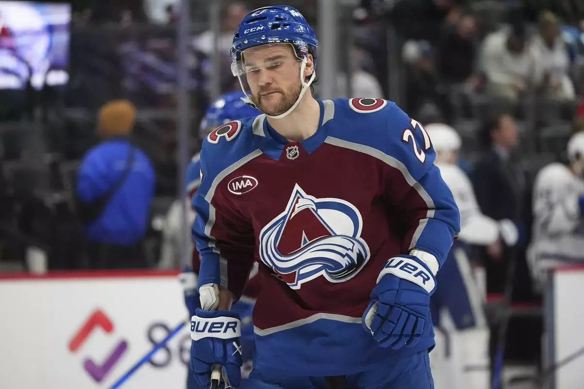 FILE - Colorado Avalanche left wing Jonathan Drouin in the second period of an NHL hockey game, March 8, 2025, in Denver. (AP Photo/David Zalubowski, file)