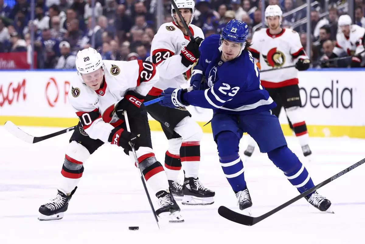 FILE - Ottawa Senators' Fabian Zetterlund (20) and Toronto Maple Leafs' Matthew Knies (23) battle for the puck during the first period of an NHL hockey playoff game in Toronto, on Tuesday, April 22, 2025. (Cole Burston/The Canadian Press via AP, File)