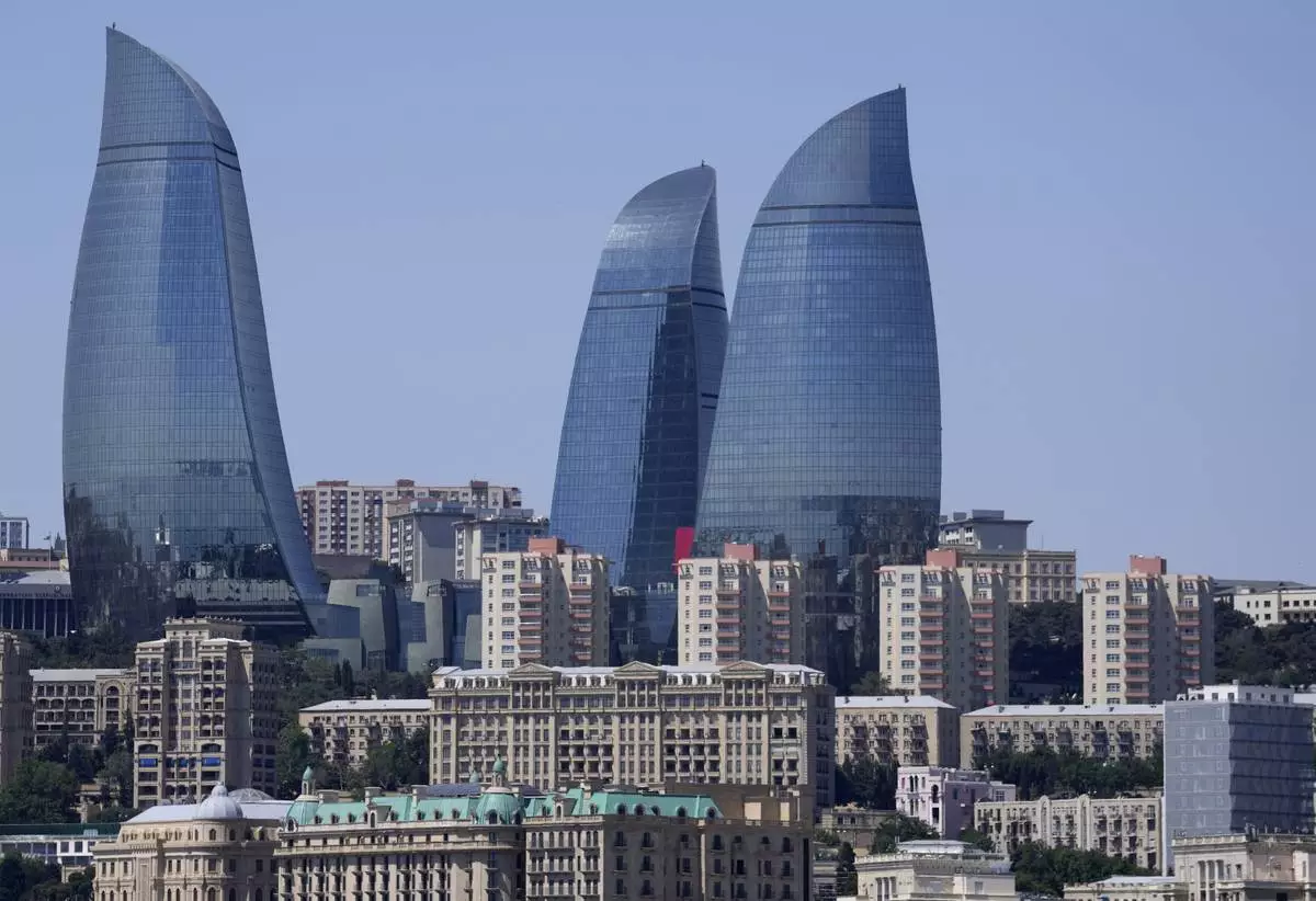 FILE - The Old City stands with the Flame Towers skyscrapers in background in Baku, Azerbaijan, June 13, 2021. (AP Photo/Darko Vojinovic, File)