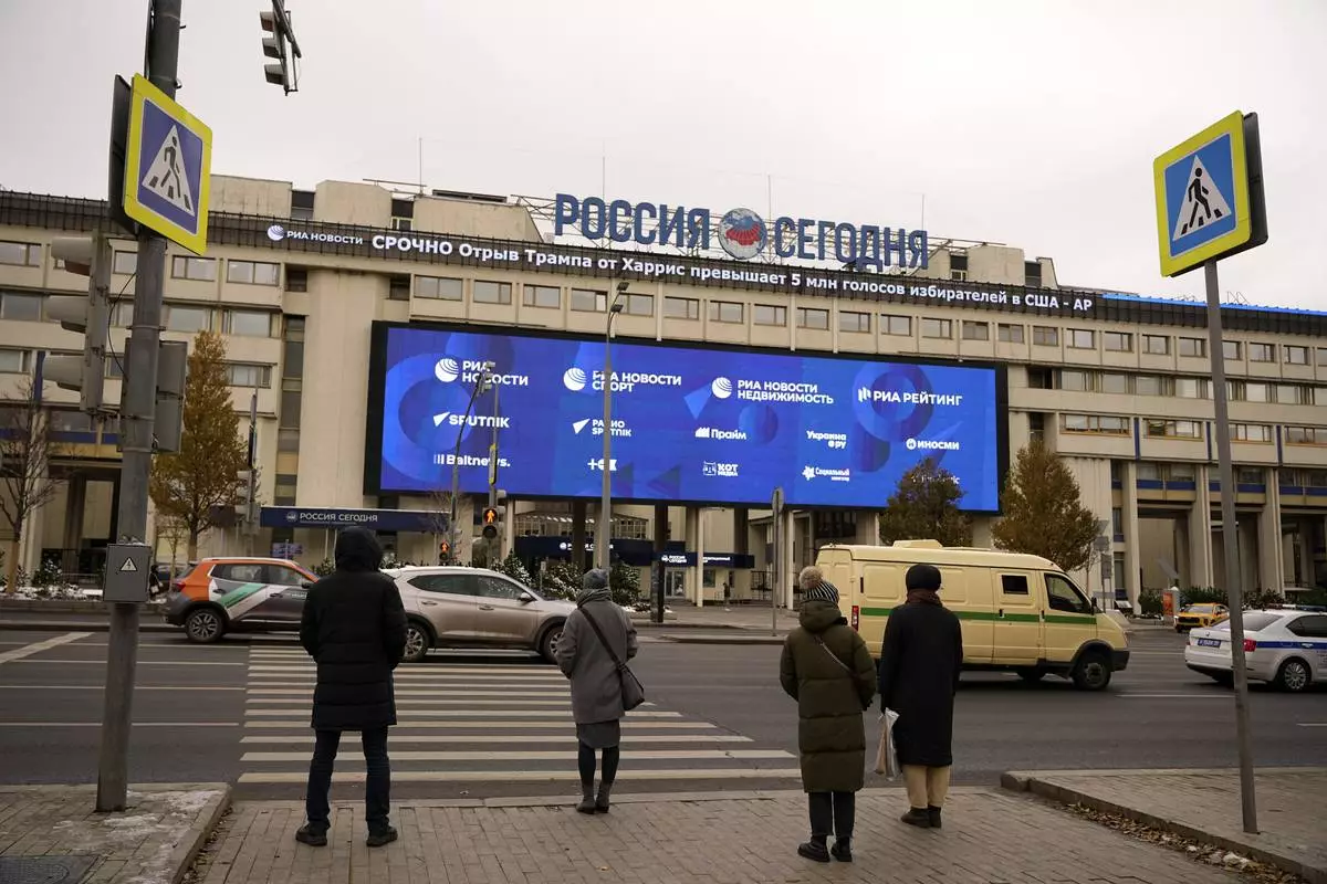 FILE - Pedestrians stand at the crossing in front of the Rossiya Segodnya International Media Group building in Moscow, Russia, on Nov. 6, 2024. (AP Photo/Pavel Bednyakov, File)