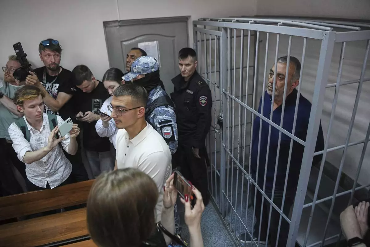 Bakir Safarov, a native of Azerbaijan, right, who faces charges as part of a Russian investigation of several killings, attends a court hearing in Yekaterinburg, Russia, on Tuesday, July 1, 2025. (AP Photo)