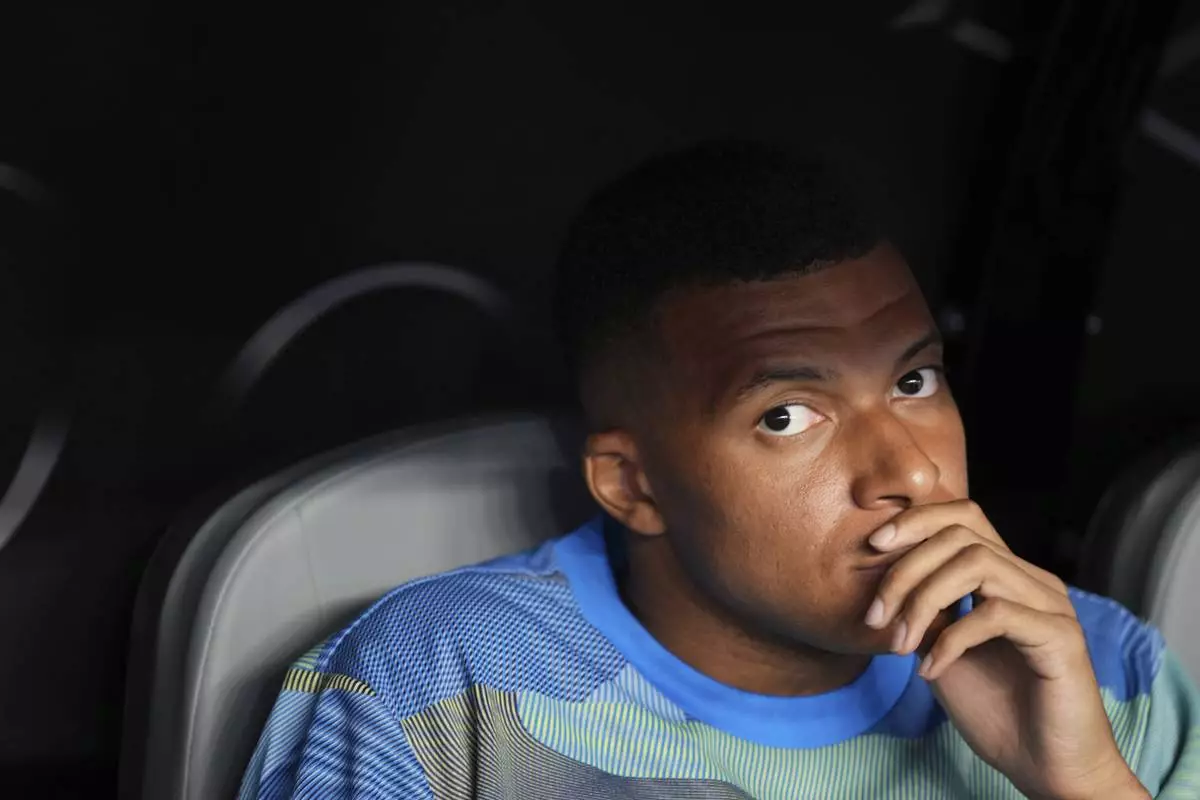 Real Madrid's Kylian Mbappe sits on the bench before the Club World Cup round of 16 soccer match between Real Madrid and Juventus in Miami Gardens, Fla., Tuesday, July 1, 2025. (AP Photo/Rebecca Blackwell)