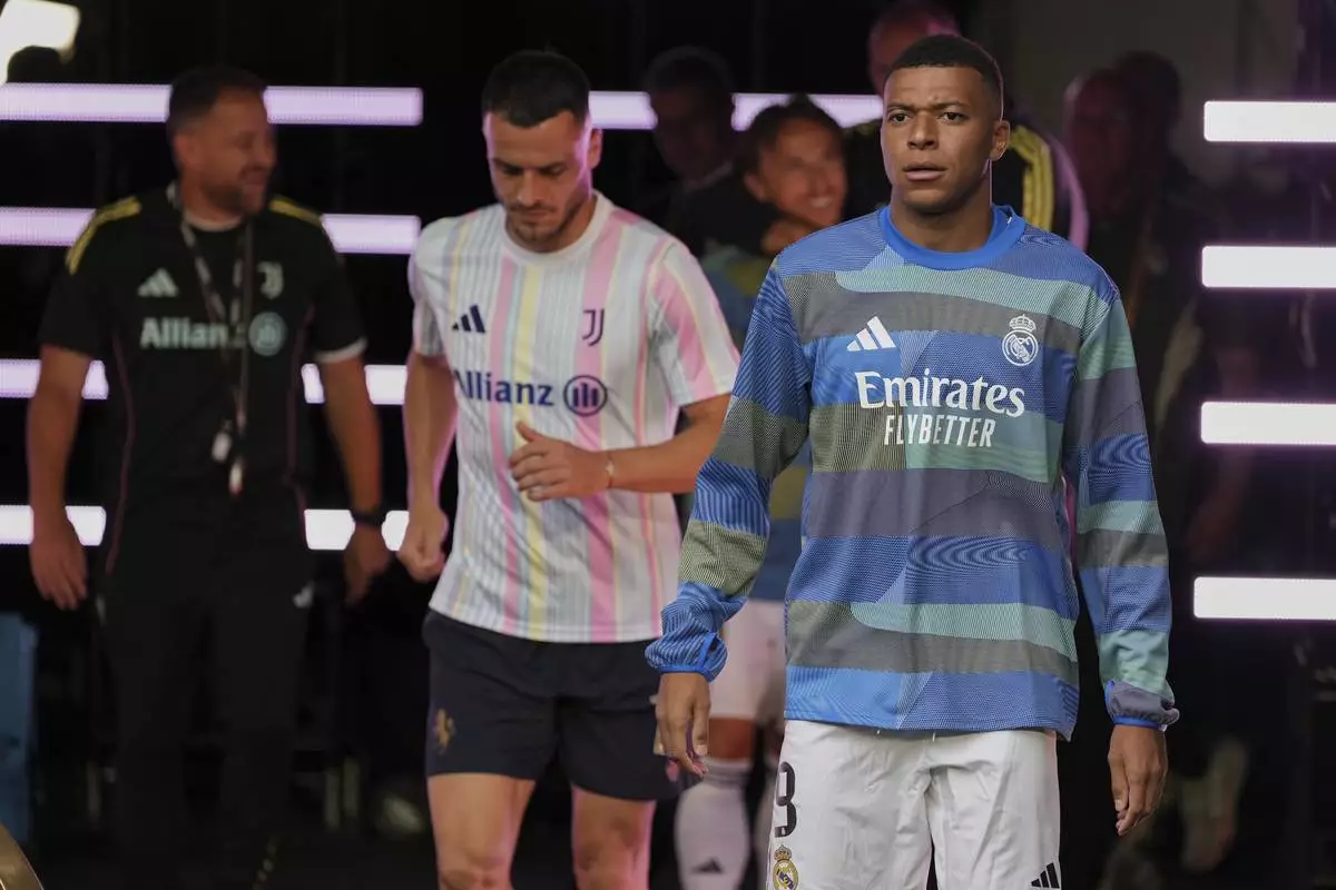 Real Madrid's Kylian Mbappe walks out to the pitch before the Club World Cup round of 16 soccer match between Real Madrid and Juventus in Miami Gardens, Fla., Tuesday, July 1, 2025. (AP Photo/Rebecca Blackwell)