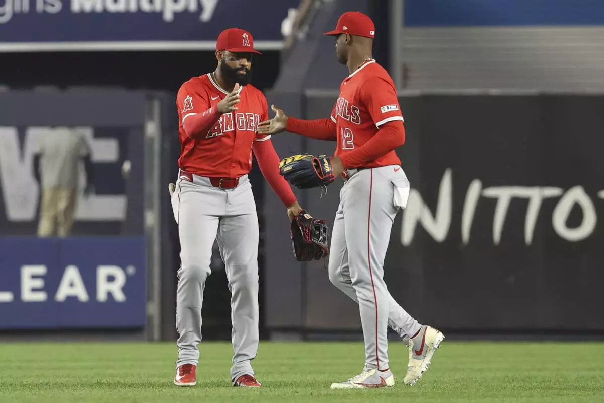 Los Angeles Angels' Jo Adell, left, and Jorge Soler, right, react after defeating the New York Yankees during a baseball game Tuesday, June 17, 2025, in New York. (AP Photo/Pamela Smith)