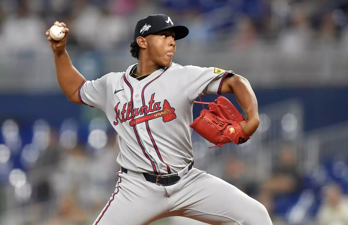 Atlanta Braves pitcher Didier Fuentes throws to a Miami Marlins batter during the first inning of a baseball game, Friday, June 20, 2025, in Miami. (AP Photo/Michael Laughlin)
