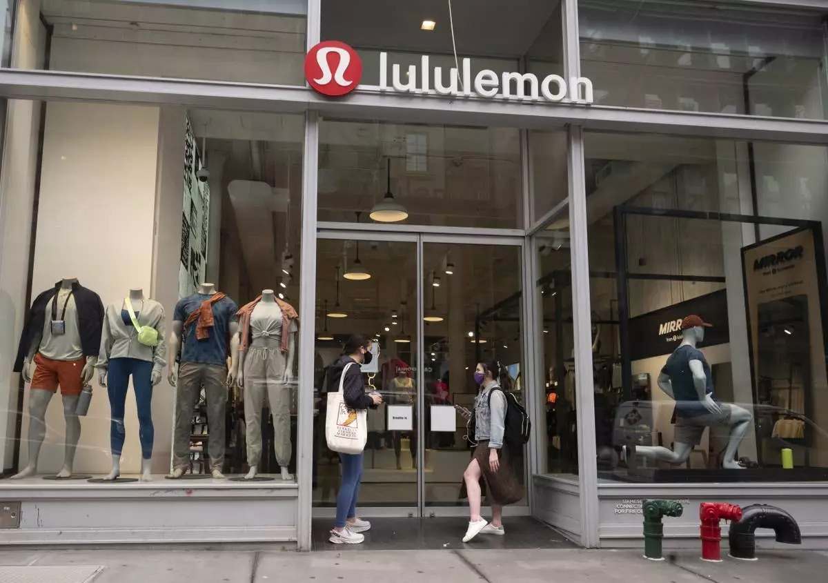 FILE - Lululemon fashions are displayed in company store windows, March 25, 2021, in New York. (AP Photo/Mark Lennihan, File)