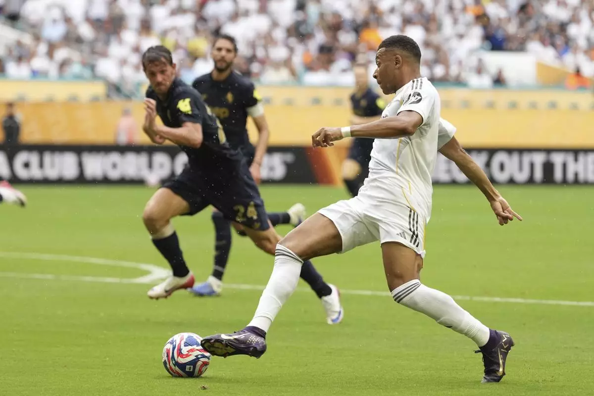 Real Madrid's Kylian Mbappe in action during the Club World Cup round of 16 soccer match between Real Madrid and Juventus in Miami Gardens, Fla., Tuesday, July 1, 2025. (AP Photo/Rebecca Blackwell)