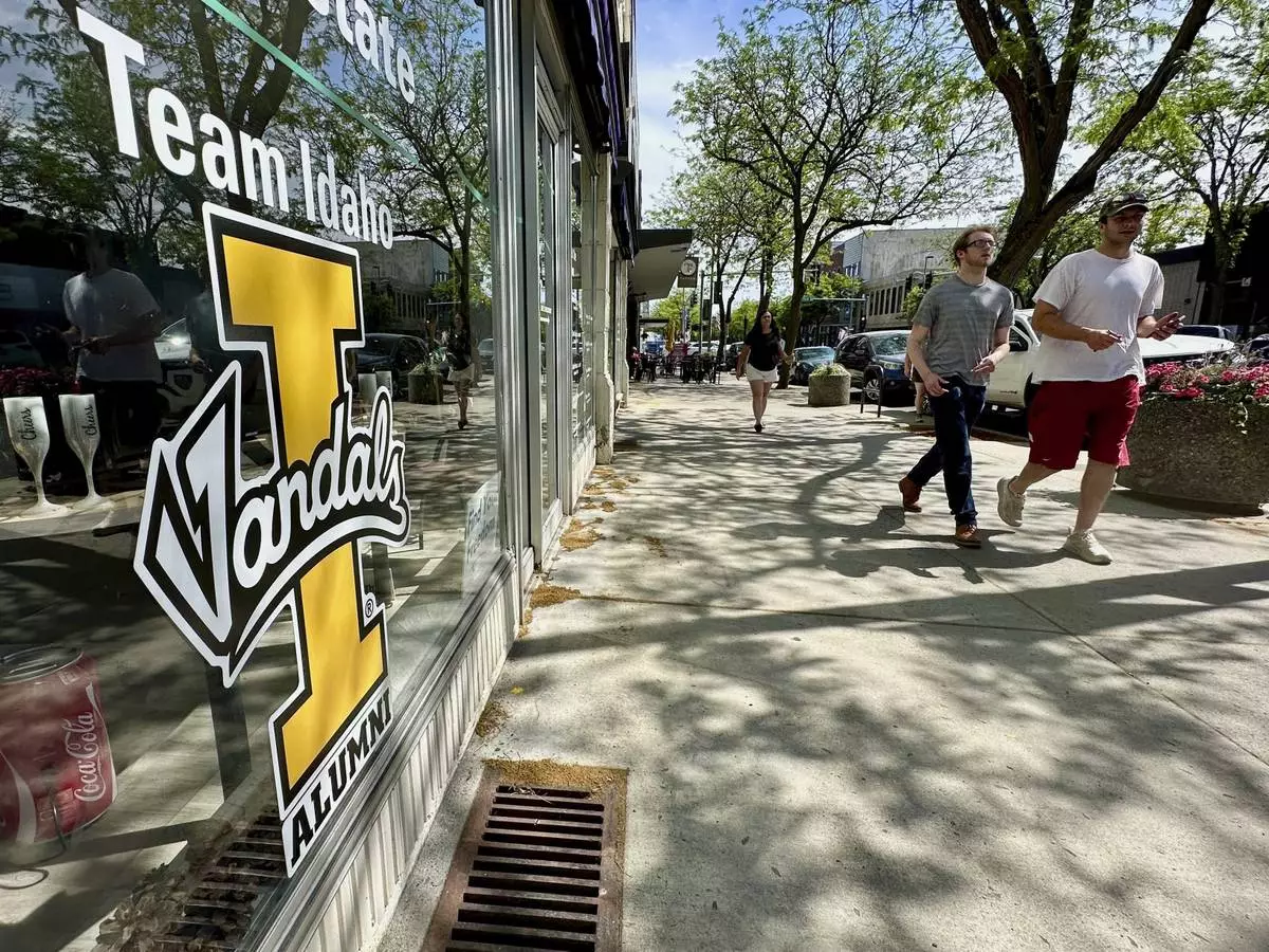 People walk on Main Street in downtown Moscow, Idaho, by a storefront with University of Idaho logo on a window on Tuesday, July 1, 2025. (AP Photos/Manuel Valdes)