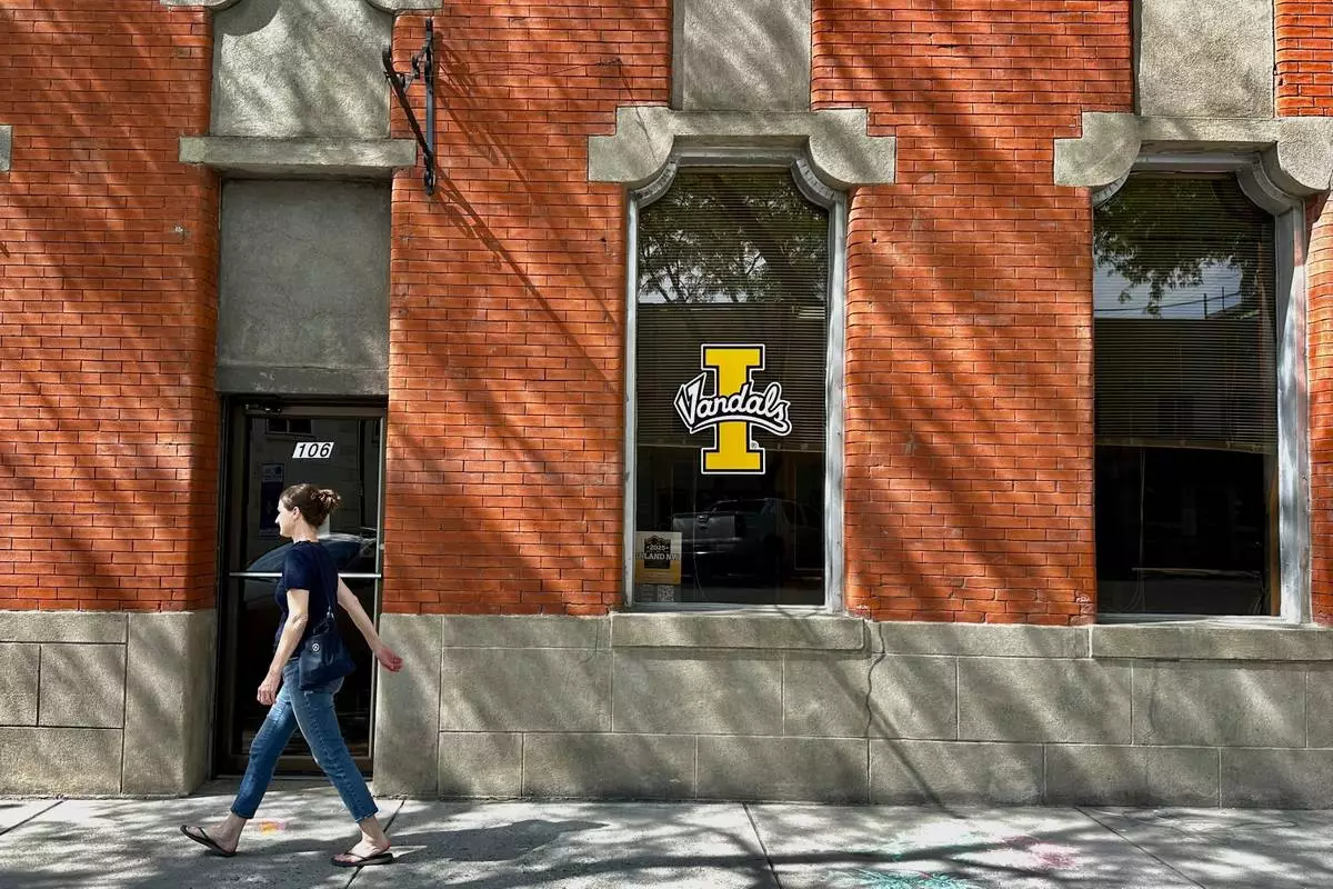 A person walks on a downtown street in Moscow, Idaho, in front of a building with a University of Idaho logo on a window on Tuesday, July 1, 2025. (AP Photos/Manuel Valdes)