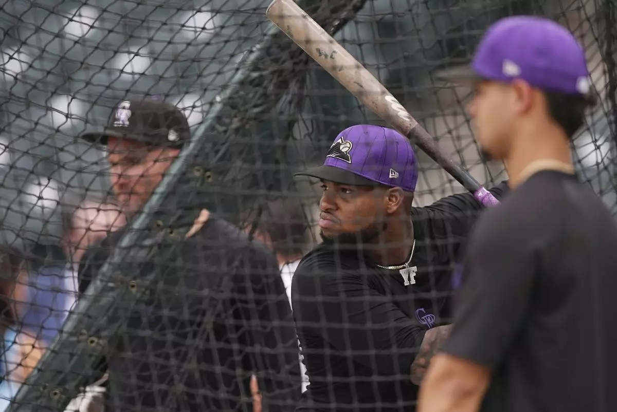 Colorado Rockies outfielder Yanquiel Fernández warms up before a baseball game against the Houston Astros, Tuesday, July 1, 2025, in Denver. (AP Photo/David Zalubowski)
