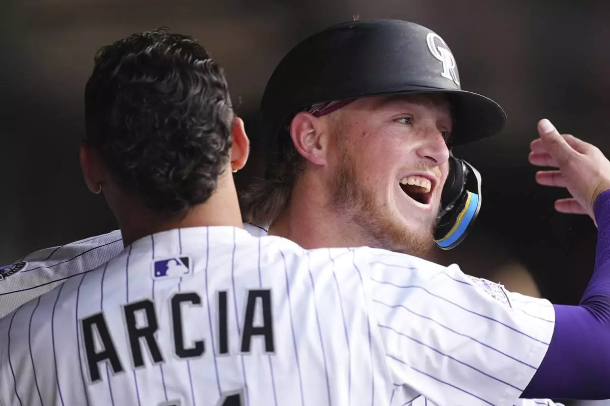 Colorado Rockies' Orlando Arcia, front, congratulates Hunter Goodman as he returns to the dugout after hitting a solo home run off Houston Astros starting pitcher Colton Gordon in the first inning of a baseball game Tuesday, July 1, 2025, in Denver. (AP Photo/David Zalubowski)