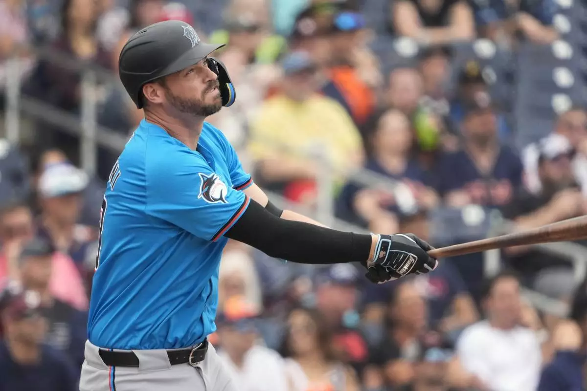 FILE - Miami Marlins' Trey Mancini watches his solo home run during the second inning of a spring training baseball game against the Houston Astros, March 10, 2024, in West Palm Beach, Fla. (AP Photo/Jeff Roberson, File)