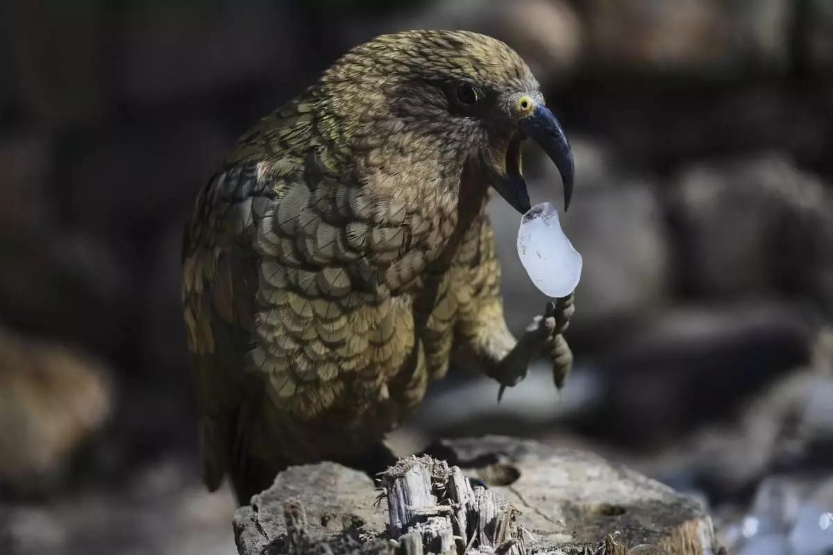 A kea parrot drops an ice cube that was brought to its enclosure on a hot and sunny day at the Zoo in Prague, Czech Republic, Tuesday, July 1, 2025. (AP Photo/Petr David Josek)