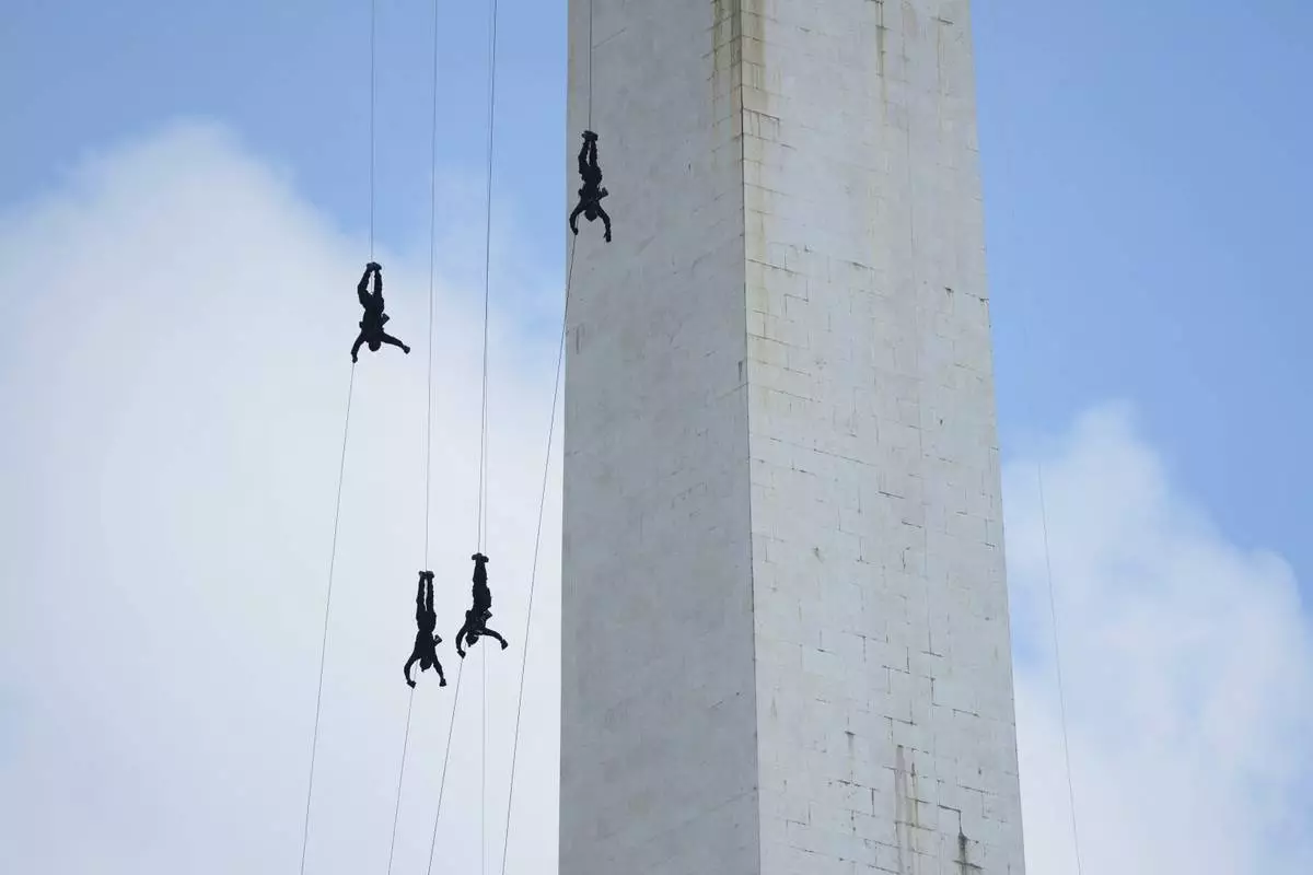Paramilitary police unit Mobile Brigade (Brimob) members rappel down the National Monument during a show marking the 79th anniversary of the Indonesian National Police in Jakarta, Indonesia, Tuesday, July 1, 2025. (AP Photo/Tatan Syuflana)