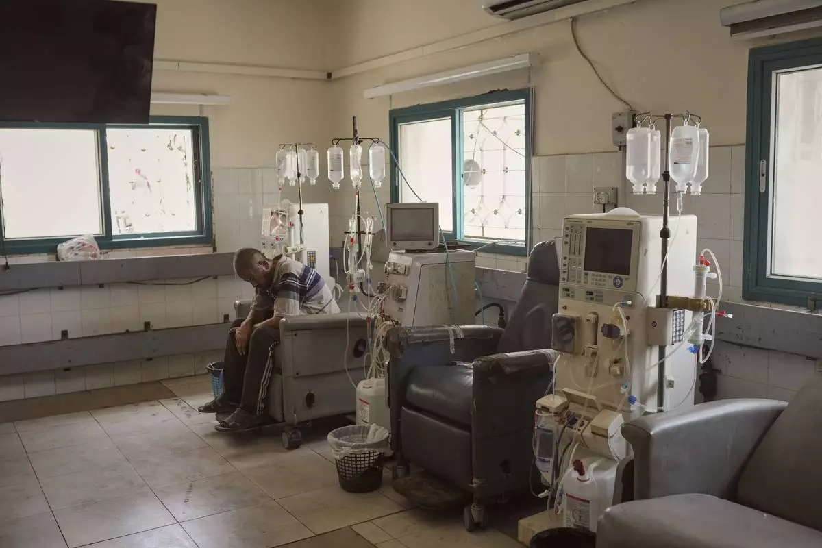 A patient sits in the dialysis unit at Shifa Hospital in Gaza City on Tuesday, July 1, 2025, after the facility suspended its services due to fuel shortages needed to power its generators. (AP Photo/Jehad Alshrafi)