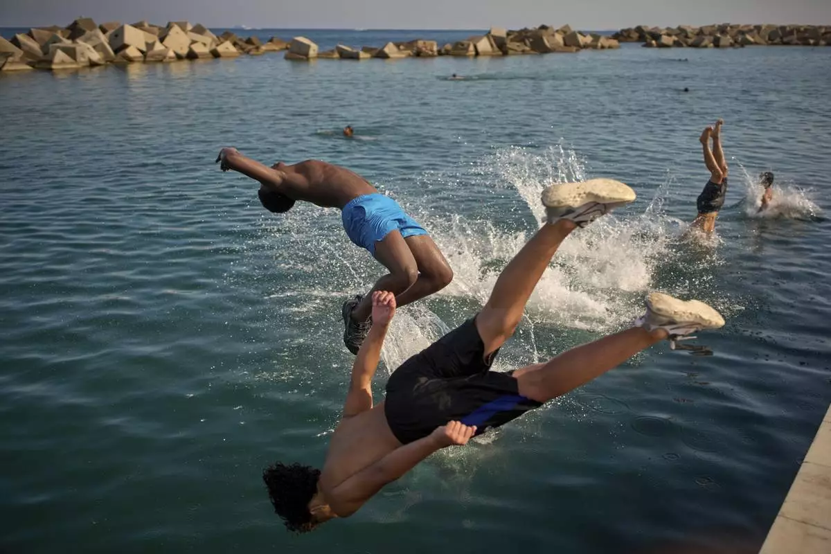 Men jump into the water on a hot day in Barcelona, Spain, Tuesday, July 1, 2025. (AP Photo/Emilio Morenatti)