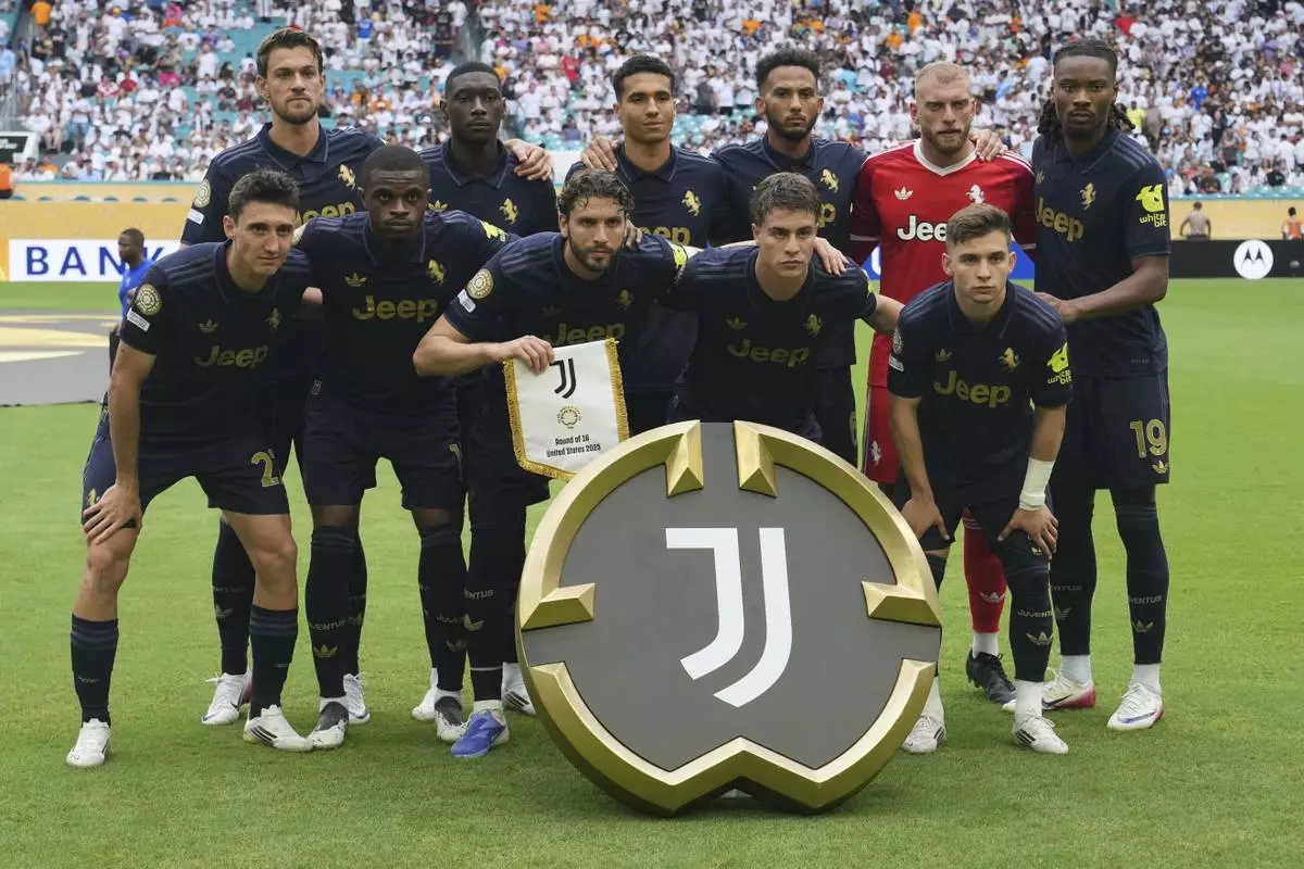 Juventus' starting 11 pose before the Club World Cup round of 16 soccer match between Real Madrid and Juventus in Miami Gardens, Fla., Tuesday, July 1, 2025. (AP Photo/Marta Lavandier)