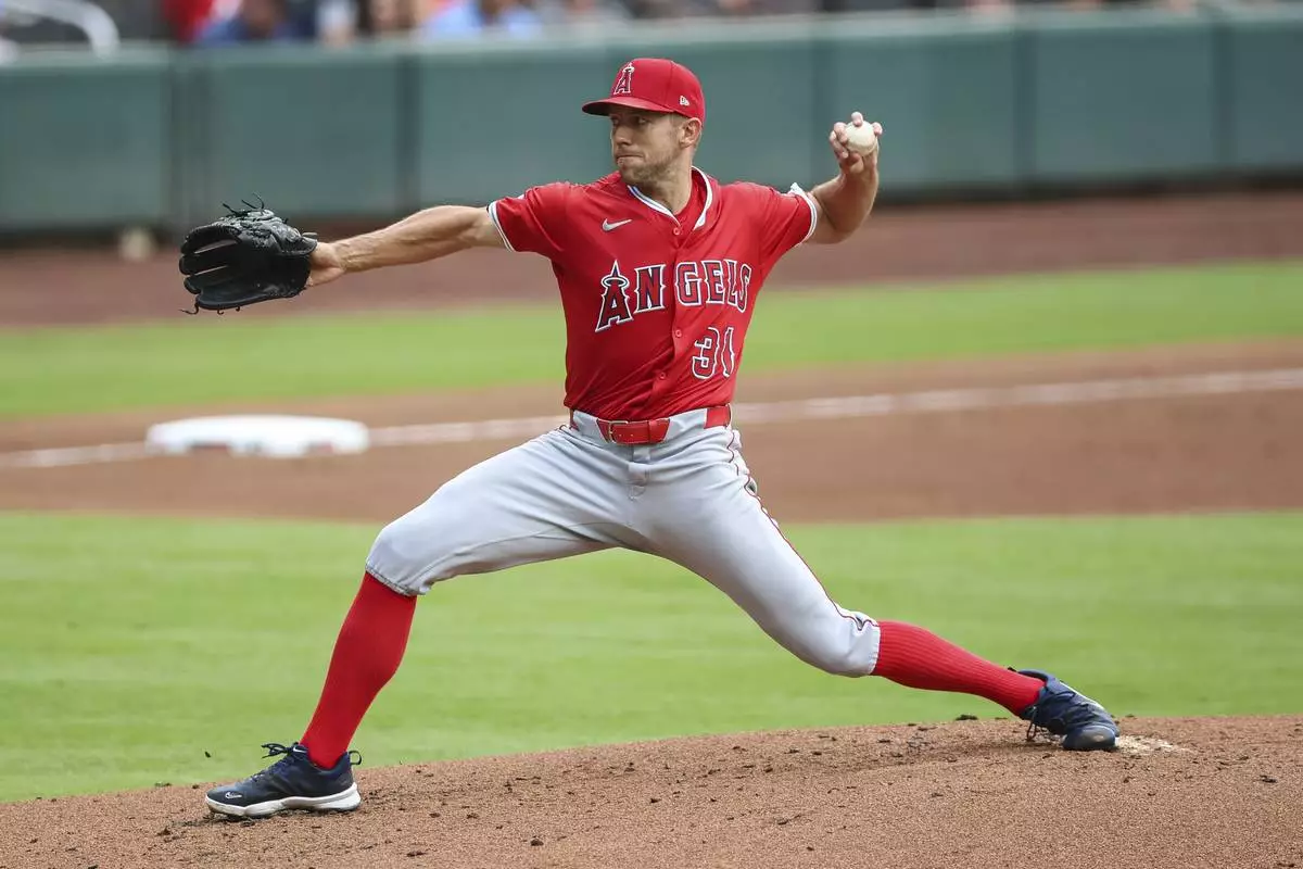 Los Angeles Angels pitcher Tyler Anderson (31) delivers in the first inning of a baseball game against the Atlanta Braves, Tuesday, July 1, 2025, in Atlanta. (AP Photo/Colin Hubbard)