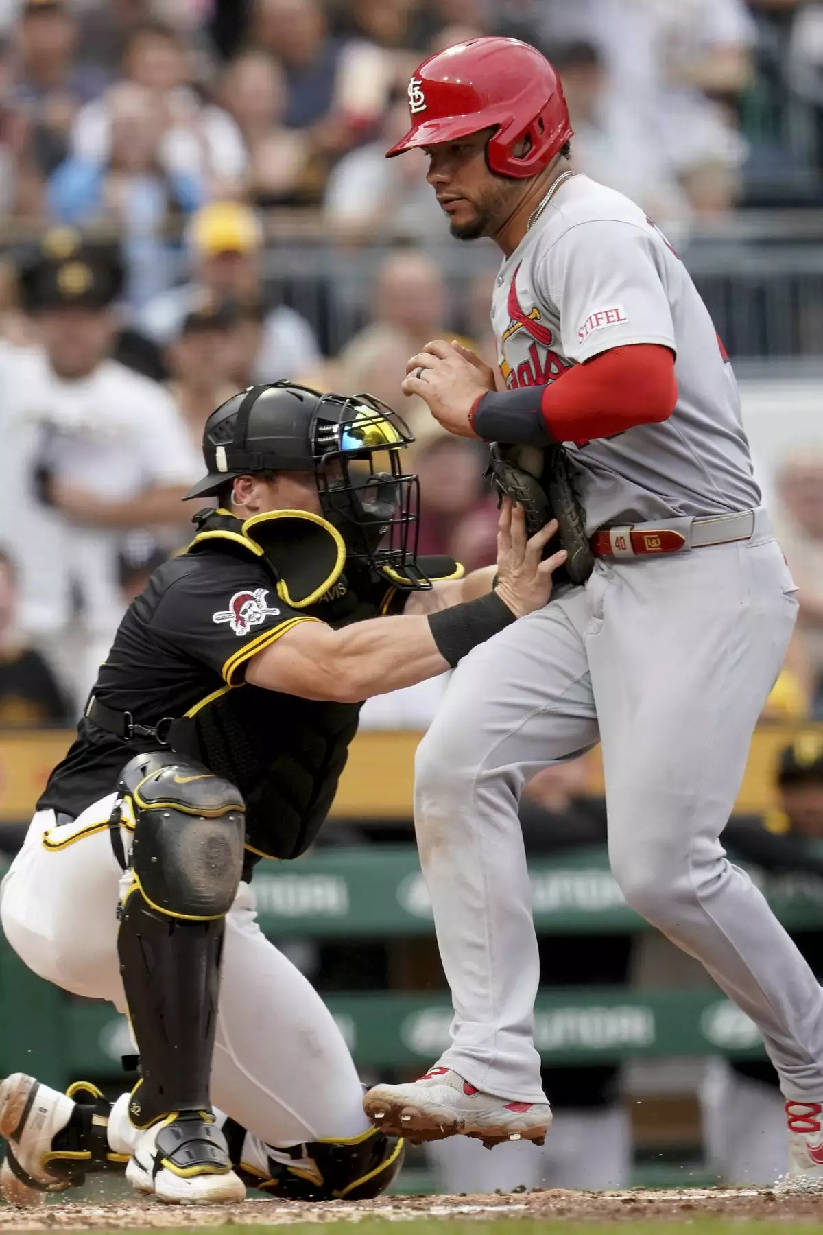 Pittsburgh Pirates catcher Henry Davis, left, tags out St. Louis Cardinals' Willson Contreras, right, at home during the fourth inning of a baseball game, Tuesday, July 1, 2025, in Pittsburgh. (AP Photo/Matt Freed)