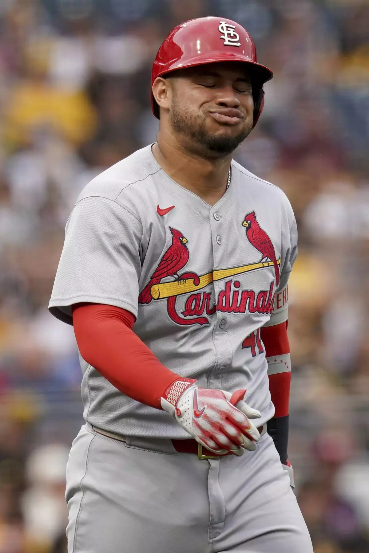St. Louis Cardinals' Willson Contreras reacts after getting hit by a pitch by Pittsburgh Pirates pitcher Paul Skenes during the fourth inning of a baseball game, Tuesday, July 1, 2025, in Pittsburgh. (AP Photo/Matt Freed)
