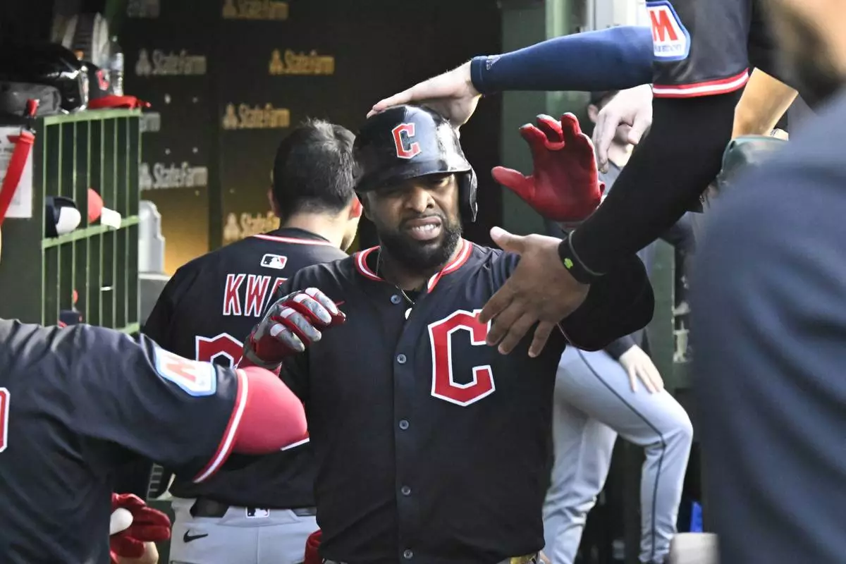Cleveland Guardians' Carlos Santana celebrates in the dugout after scoring during the fourth inning of a baseball game against the Chicago Cubs, Tuesday, July 1, 2025, in Chicago. (AP Photo/Matt Marton)