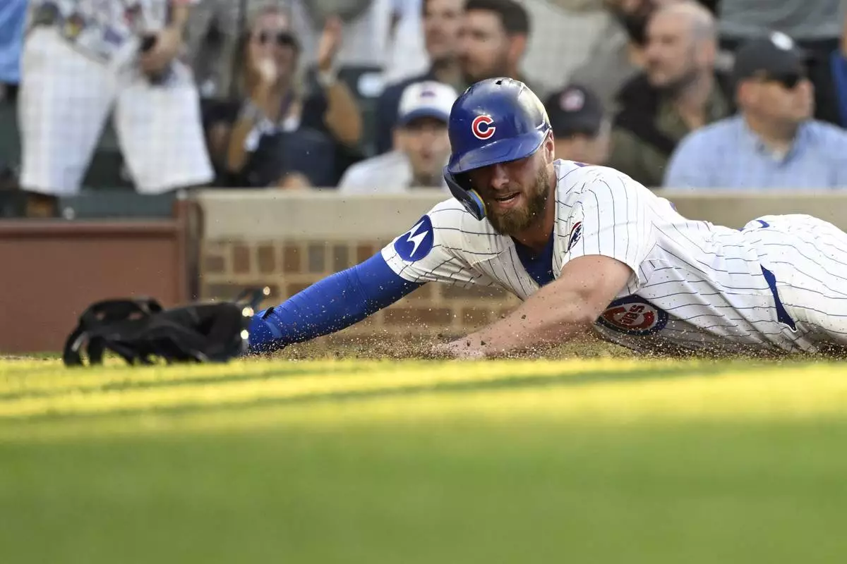 Chicago Cubs' Michael Busch scores during the second inning of a baseball game against the Cleveland Guardians, Tuesday, July 1, 2025, in Chicago. (AP Photo/Matt Marton)
