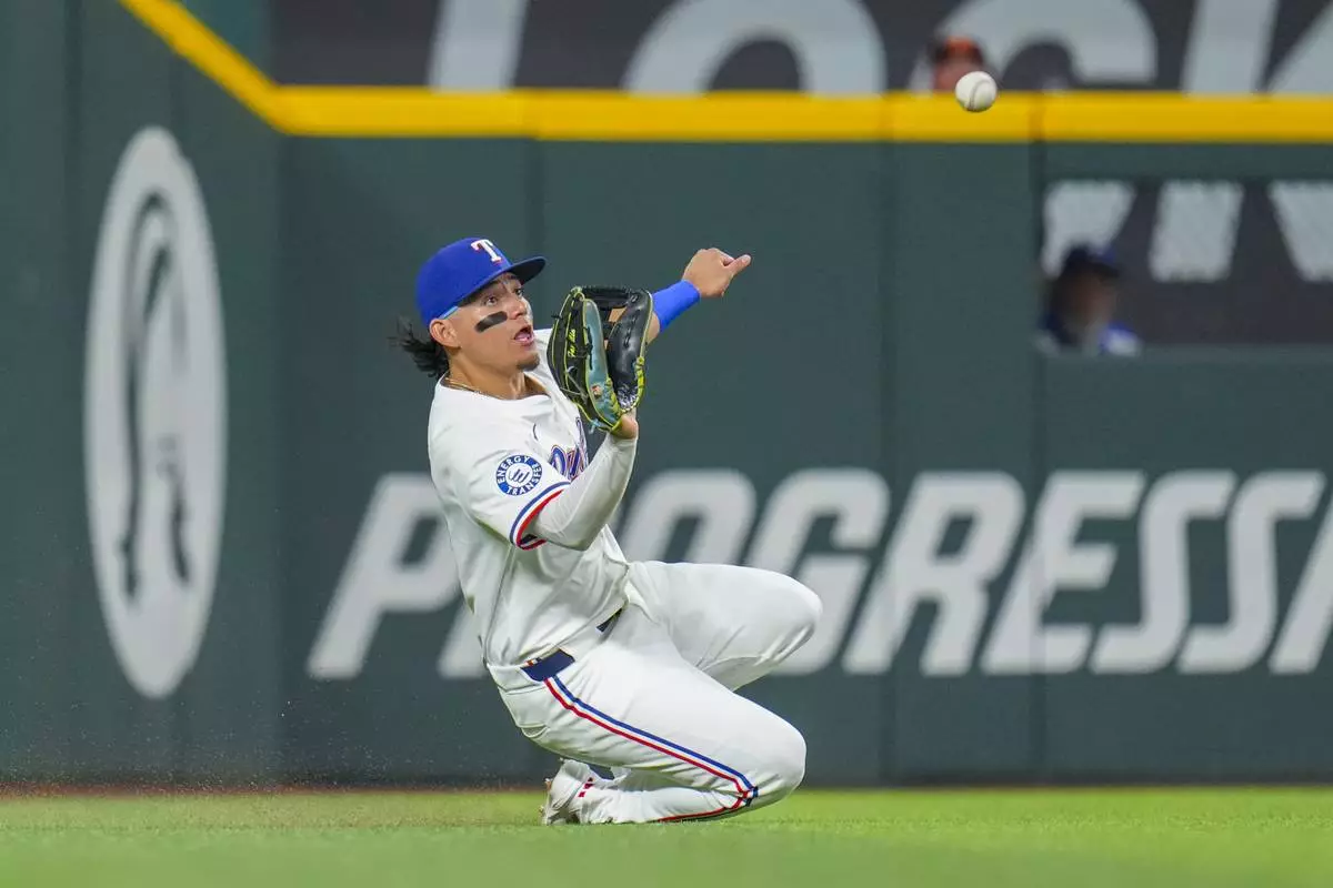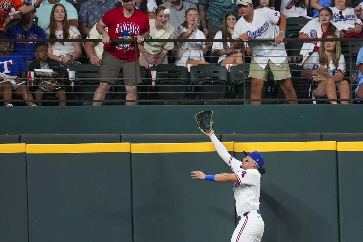 Texas Rangers outfielder Alejandro Osuna hops near the fence to try to catch a two-run home run by Baltimore Orioles' Gary Sánchez during the fourth inning of a baseball game Tuesday, July 1, 2025, in Arlington, Texas. (AP Photo/Julio Cortez)