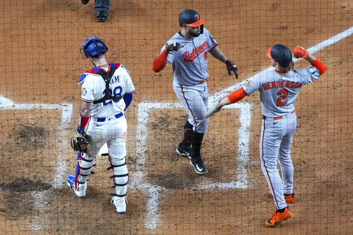 Baltimore Orioles' Gary Sánchez, center, is greeted near home plate by Gunnar Henderson, right, as Texas Rangers catcher Jonah Heim looks on after Sánchez scored both of them on a two-run home run during the fourth inning of a baseball game Tuesday, July 1, 2025, in Arlington, Texas. (AP Photo/Julio Cortez)
