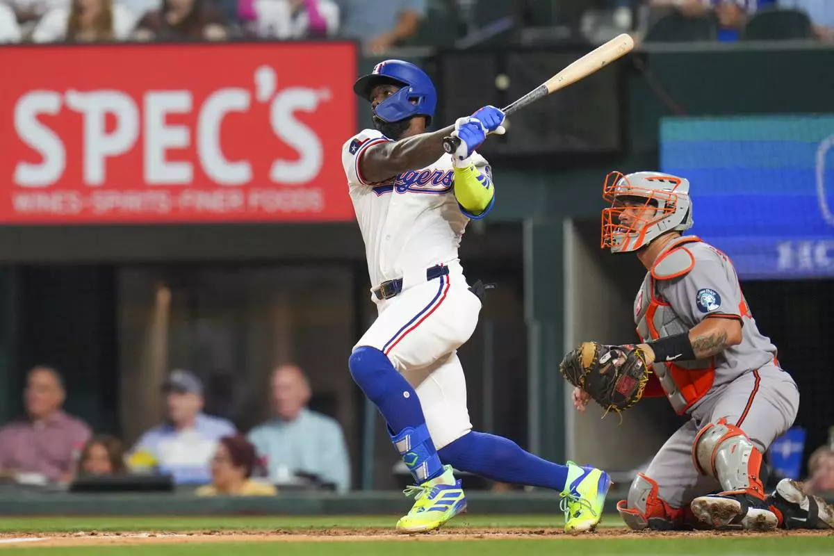 Texas Rangers' Adolis García follows through while hitting a double against the Baltimore Orioles during the fifth inning of a baseball game Tuesday, July 1, 2025, in Arlington, Texas. (AP Photo/Julio Cortez)