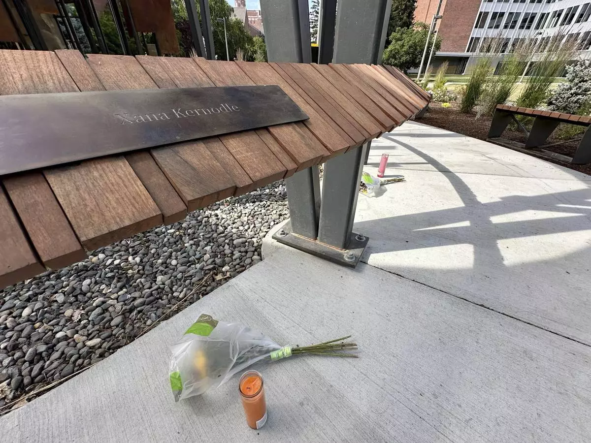 A flower and a candle were left below the name plaque for Xana Kernodle, one of the four University of Idaho students killed in November 2022 at their off campus house in Moscow, Idaho, on Tuesday, July 1, 2025. (AP Photo/Manuel Valdes)
