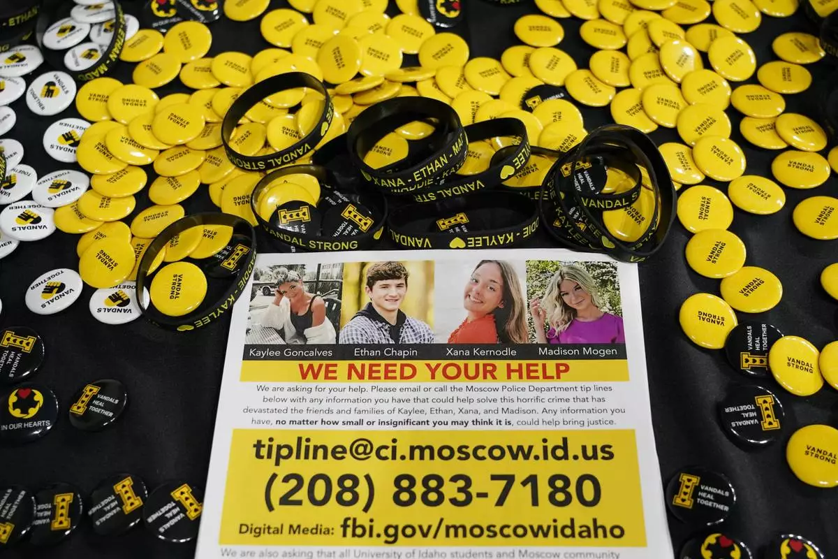 FILE - A flyer seeking information about the killings of four University of Idaho students who were found dead is displayed on a table along with buttons and bracelets on Nov. 30, 2022, during a vigil in memory of the victims in Moscow, Idaho. (AP Photo/Ted S. Warren, File)