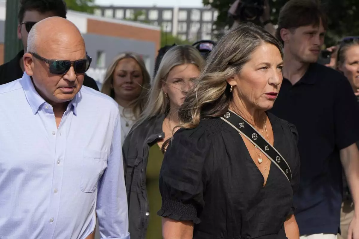 The family of Ethan Chapin including mother Stacy Chapin and father Jim Chapin walk to the Ada County Courthouse for Bryan Kohberger's plea deal hearing on Wednesday, July 2, 2025, in Boise, Idaho. (AP Photo/Jenny Kane)