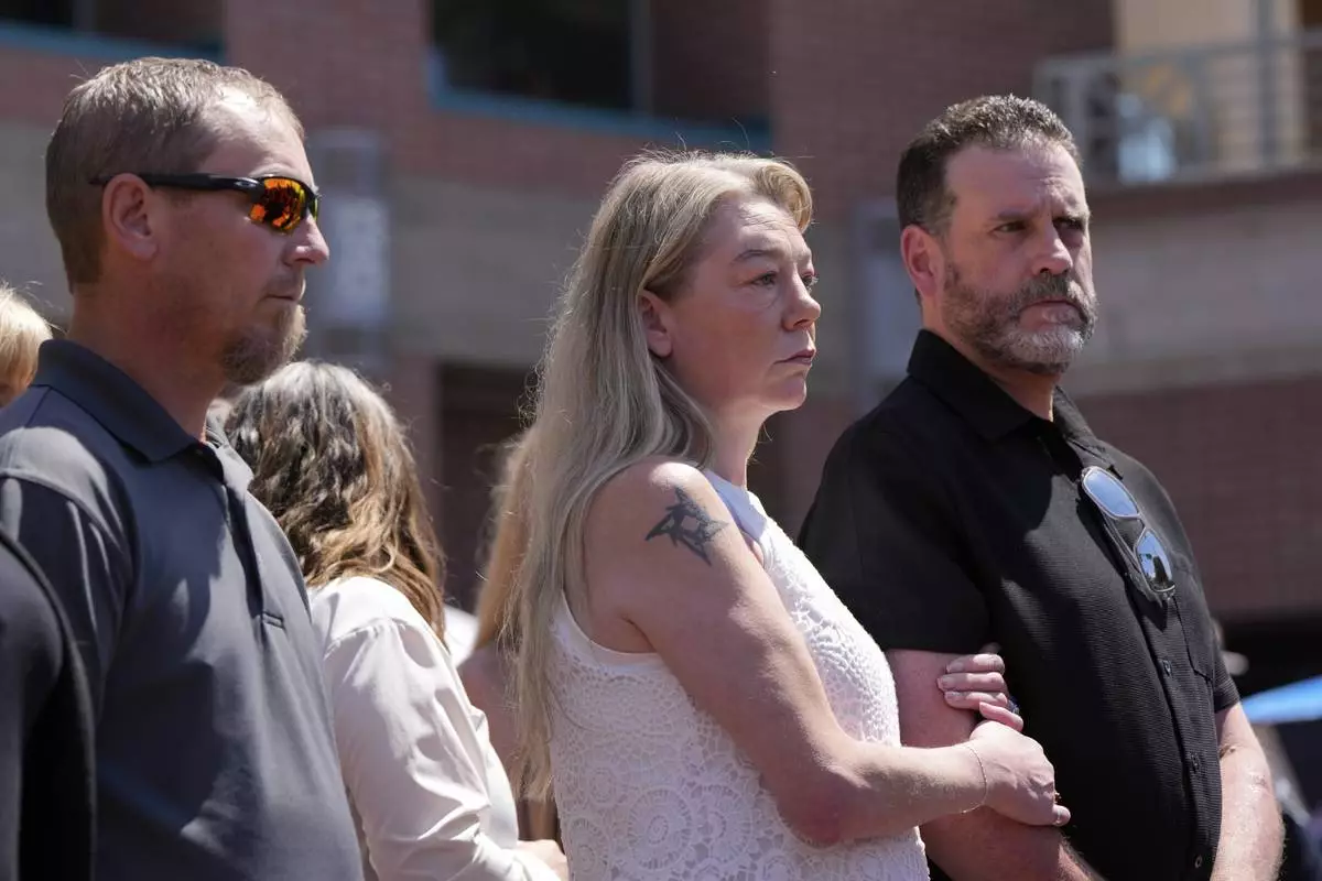 Karen and Scott Laramie, the mother and stepfather of Madison Mogen, listen as their attorney Leander James makes a statement to members of the media outside the Ada County Courthouse on Wednesday, July 2, 2025, in Boise, Idaho. (AP Photo/Jenny Kane)