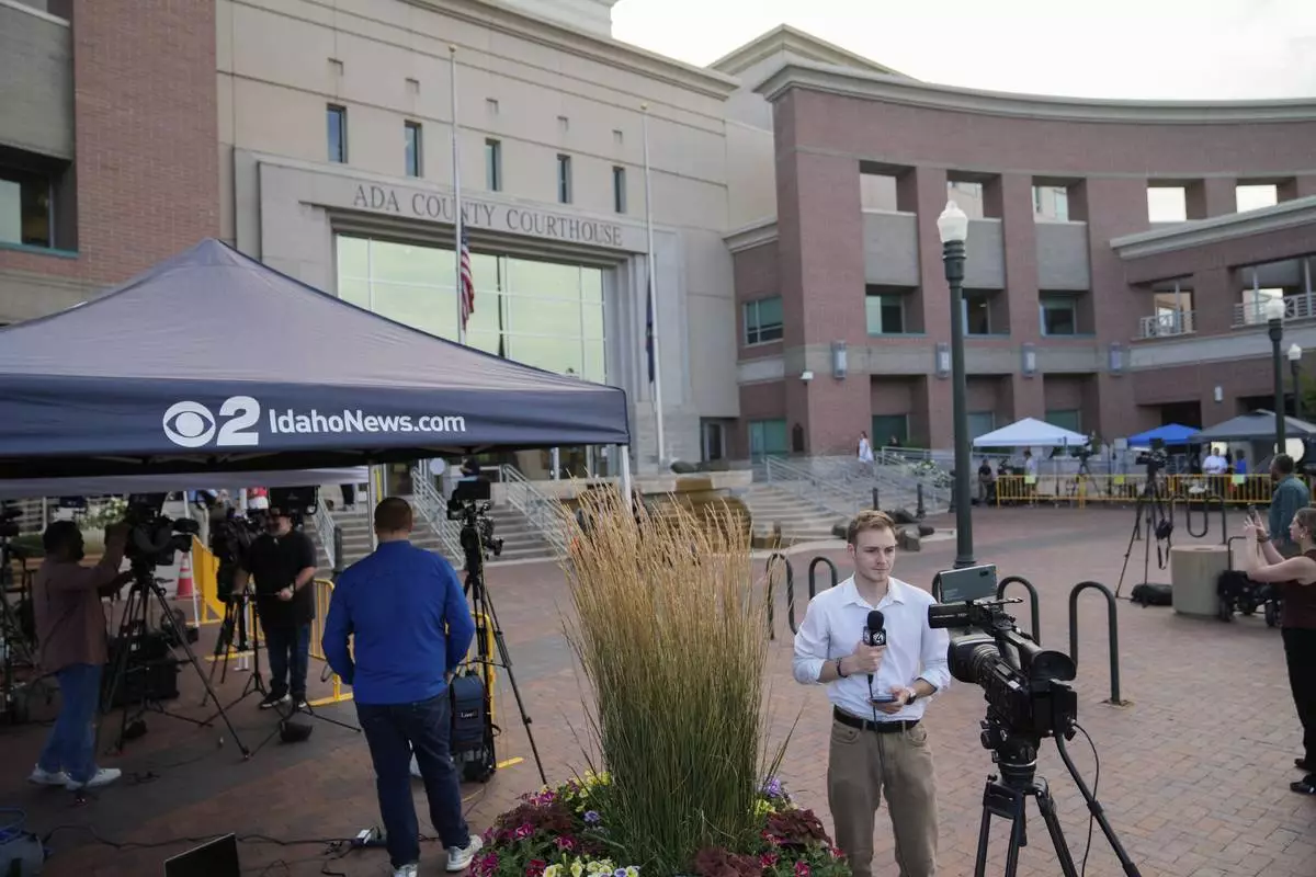 Members of the media stand outside the Ada County Courthouse for the Bryan Kohberger plea deal hearing on Wednesday, July 2, 2025, in Boise, Idaho. (AP Photo/Jenny Kane)