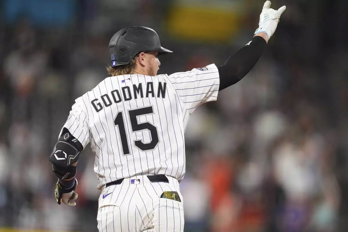 Colorado Rockies' Hunter Goodman gestures to the bullpen as he circles the bases after hitting a solo home run off Houston Astros relief pitcher Josh Hader in the ninth inning of a baseball game Tuesday, July 1, 2025, in Denver. (AP Photo/David Zalubowski)