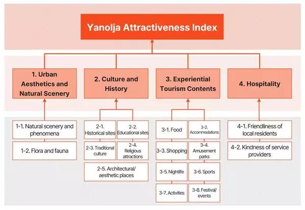Based on these two pillars, Yanolja Research conducted a comprehensive evaluation by segmenting a tourism city's attractiveness into four key dimensions: â–²Beauty and Natural Scenery of the City â–²Culture and History of the City â–²Experiential Content of the City â–²Hospitality of the City.