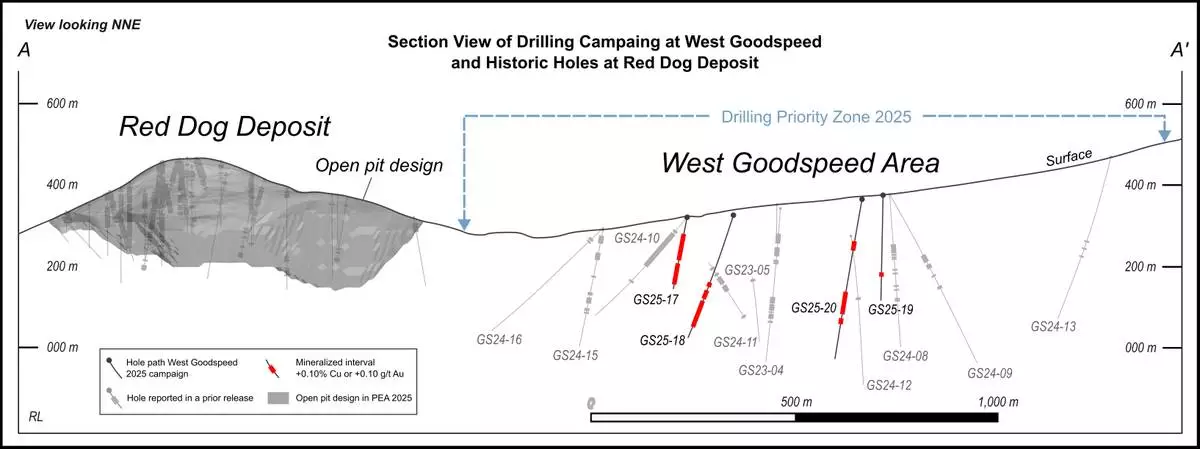 Figure 2 shows the location of the drill holes announced in this press release in context with other drilling in the West Goodspeed area, while Figure 3 shows the drilling on a longitudinal section through Red Dog and West Goodspeed.