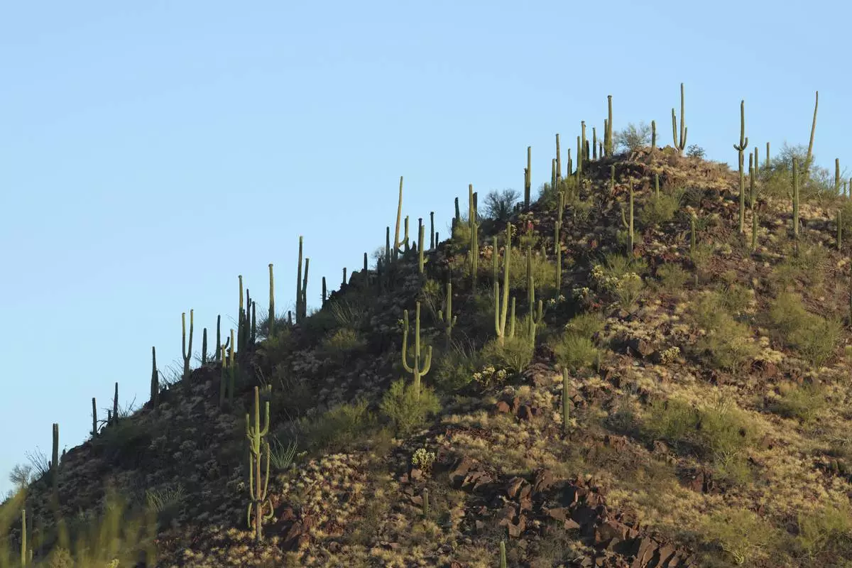 The early sun illuminates a forest of giant saguaro cacti during fruit harvest season for the Tohono Oʼodham people in Saguaro National Park near Tucson, Ariz., on Tuesday, June 24, 2025. (AP Photo/Ross D. Franklin)