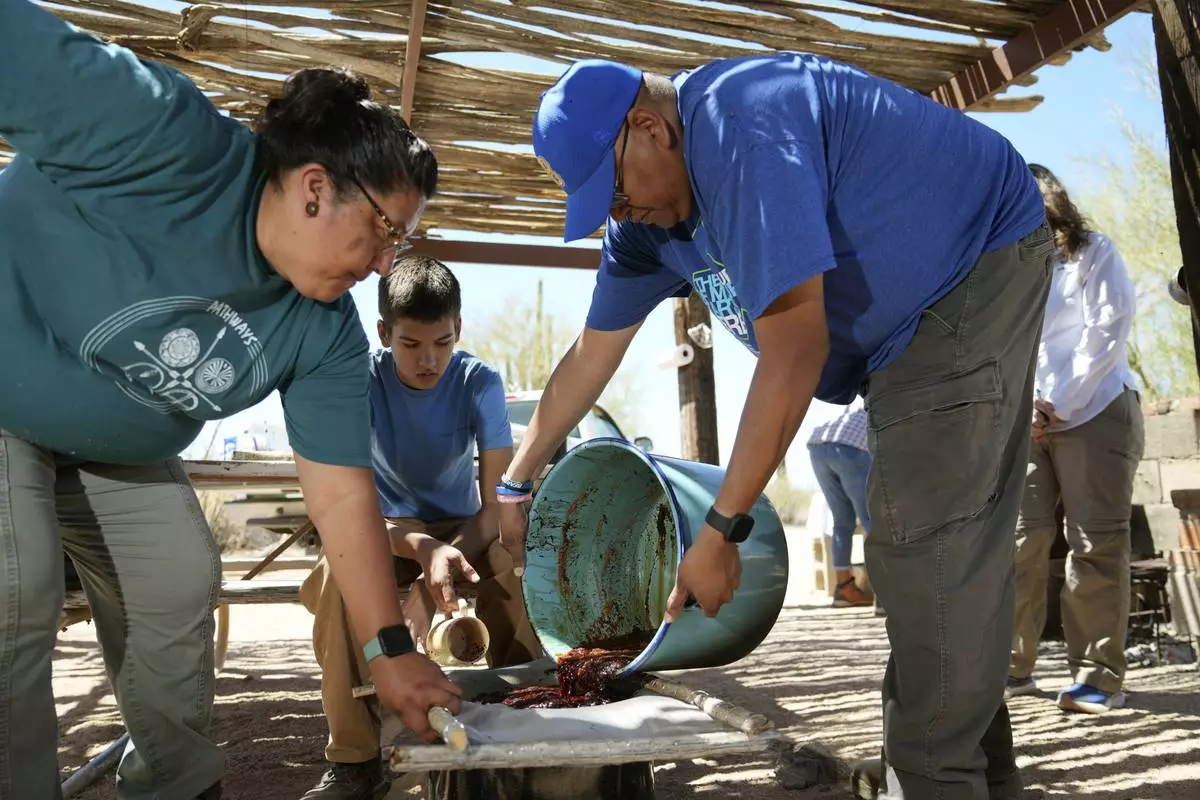 Silas Garcia, right, pours fresh saguaro cactus fruit onto a strainer as Maria Francisco, left, holds the frame while a youth volunteer looks on during a harvest day by the Tohono Oʼodham people in Saguaro National Park near Tucson, Ariz., on Monday, June 23, 2025. (AP Photo/Ross D. Franklin)