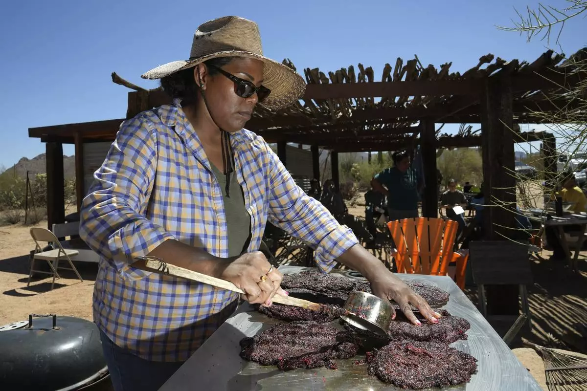 Tanisha Tucker Lohse checks on several patties of drying saguaro cactus fruit from a harvest for the Tohono Oʼodham people in Saguaro National Park near Tucson, Ariz., on Monday, June 23, 2025. (AP Photo/Ross D. Franklin)