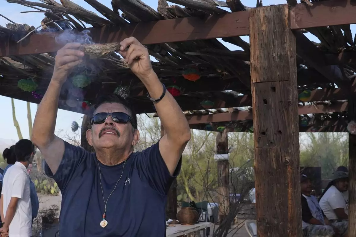 John Vasquez Bedoy blesses the ramada, a canopy topped with saguaro ribs to provide shade, with sage prior to a St. John the Baptist's feast day Mass in Saguaro National Park near Tucson, Ariz., on Tuesday, June 24, 2025. (AP Photo/Ross D. Franklin)