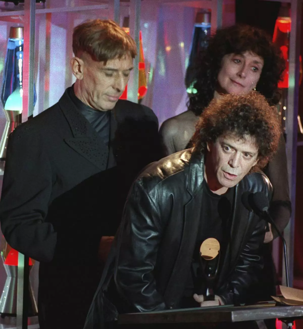 FILE - Lou Reed speaks at the podium, center, as he and his Velvet Underground band mates John Cale, left, and at Martha Morrison are inducted into the Rock and Roll Hall of Fame in New York on s Jan. 17, 1996. (AP Photo/Mark Lennihan, File)