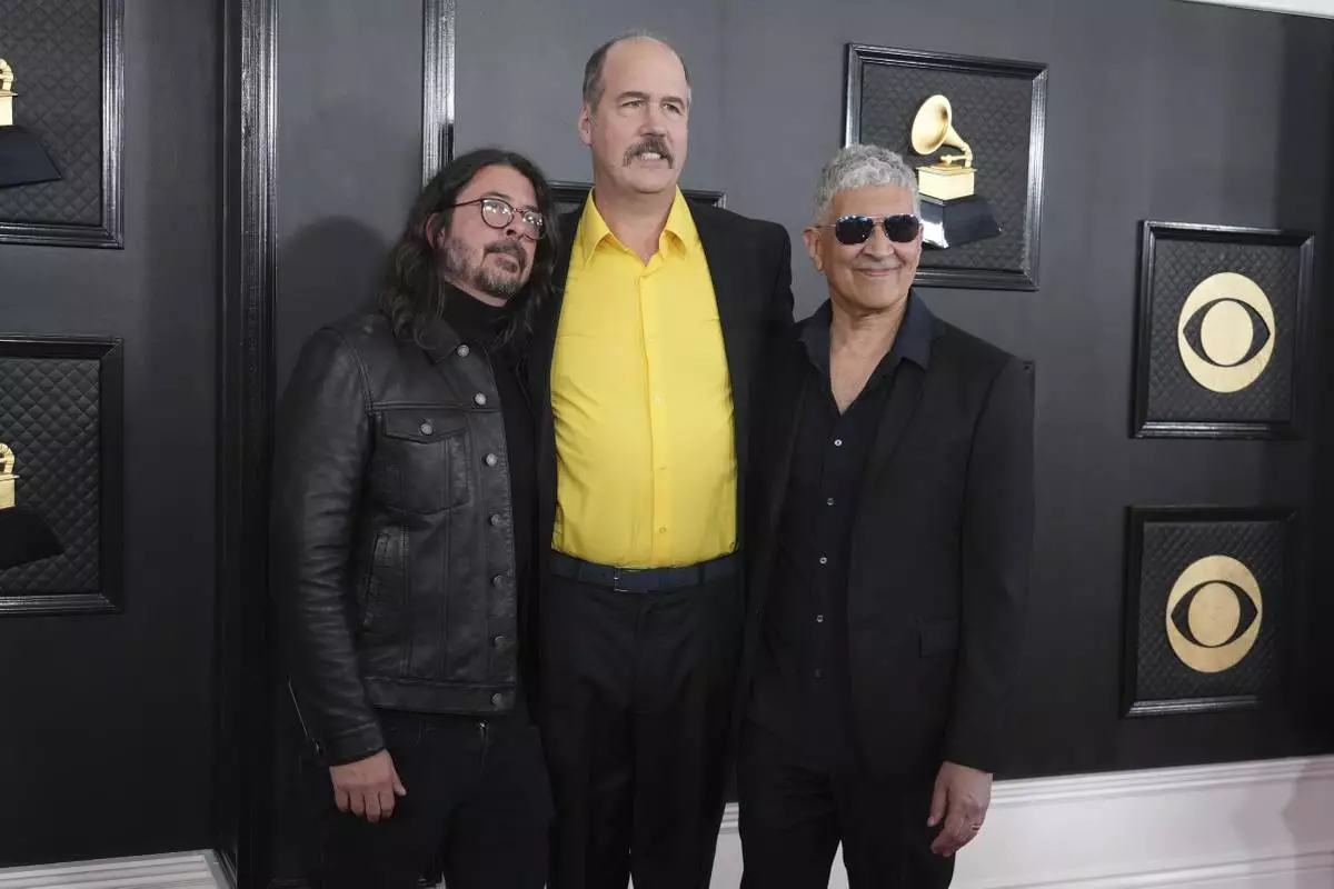FILE - Dave Grohl, from left, Krist Novoselic, and Pat Smear of Nirvana appear at the 65th annual Grammy Awards on Feb. 5, 2023, in Los Angeles. (Photo by Jordan Strauss/Invision/AP, File)